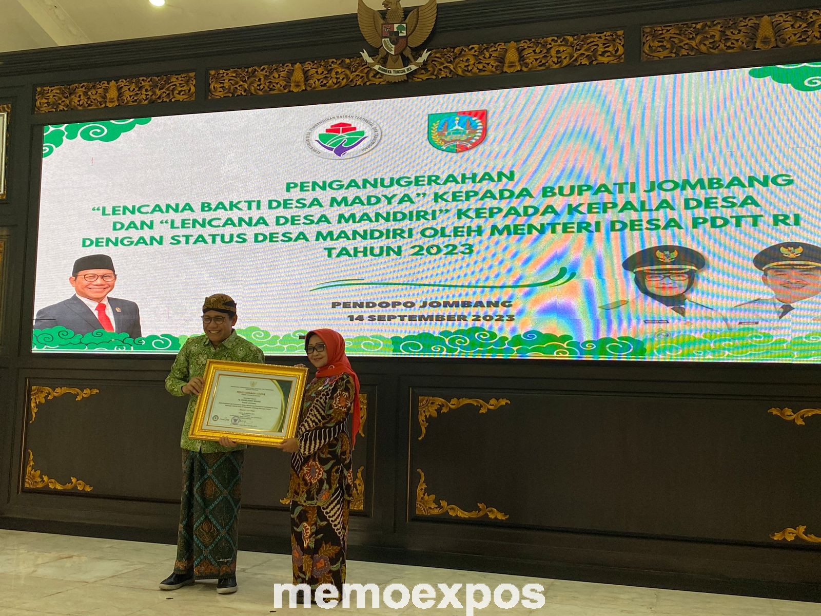 Lencana Desa Madya diterima oleh Bupati Jombang Hj Mundjidah Wahab dilanjutkan penyerahan Lencana Desa Mandiri kepada 45 kepala desa. Prosesi penyerahan lencana dan piagam penghargaan diberikan langsung oleh Mendes PDTT Abdul Halim Iskandar di Pendopo Kabupaten Jombang, Kamis (14/9/2023).