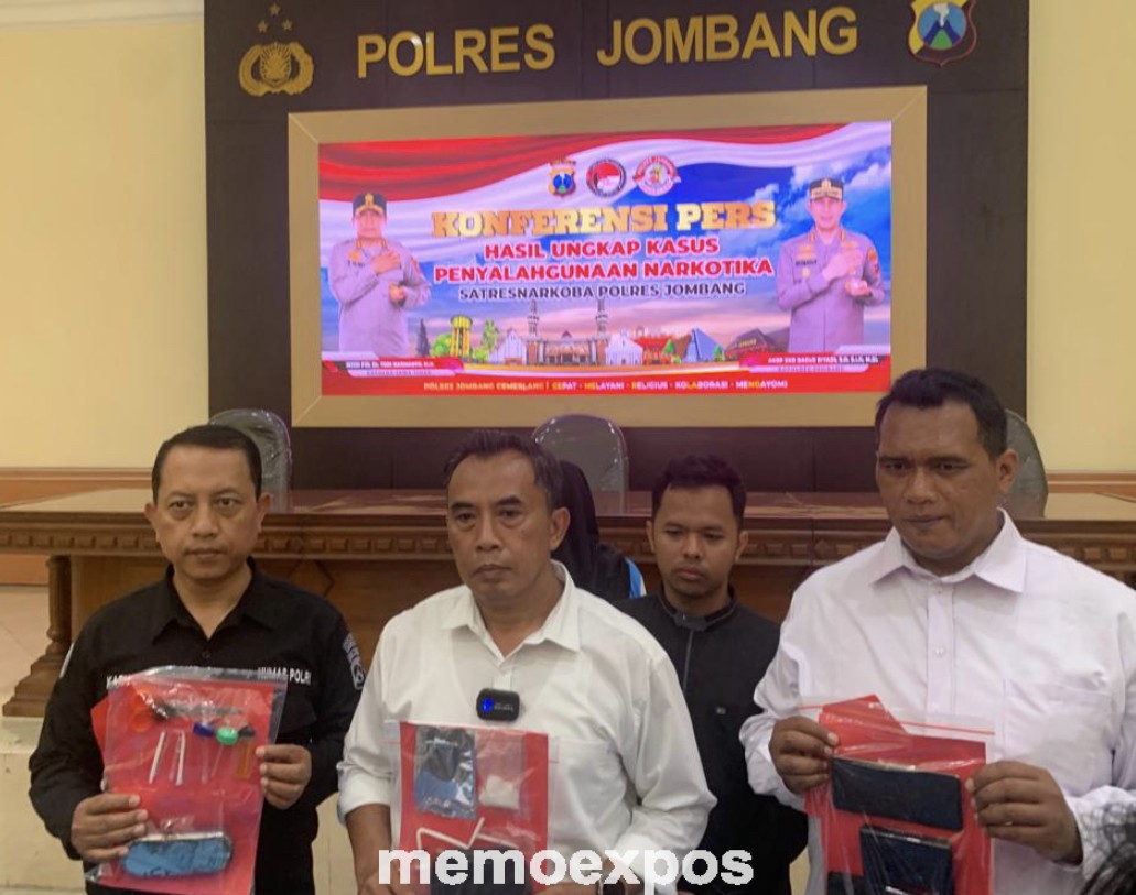 Kasat Resnarkoba Polres Jombang AKP Komar Sasmito (tengah) saat jumpa pers di Mapolres srtempat. (memoexpos.co)