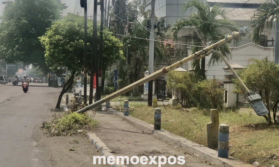 memoexpos.co – Tiang Penerangan Jalan Umum (PJU) di Jalan Raya Soekarno Hatta, Desa Mojongapit, Kecamatan Jombang, Kabupaten Jombang nampak roboh ke sisi trotoar.