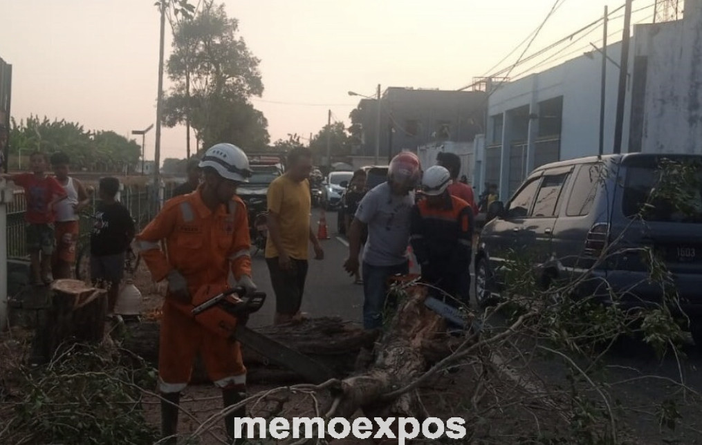 Diduga pohon tumbang akibat angin kencang, saat itu ada pengendara motor yang melintas sehingga menimpa pengendara.