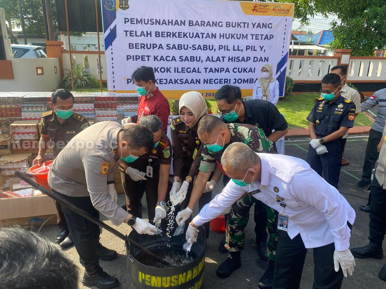 Seluruhnya dimusnahkan dengan cara dibakar, direndam air, dan dihancurkan menggunakan martil di halaman Kejaksaan Negeri Jombang pada Rabu (16/7/2025).