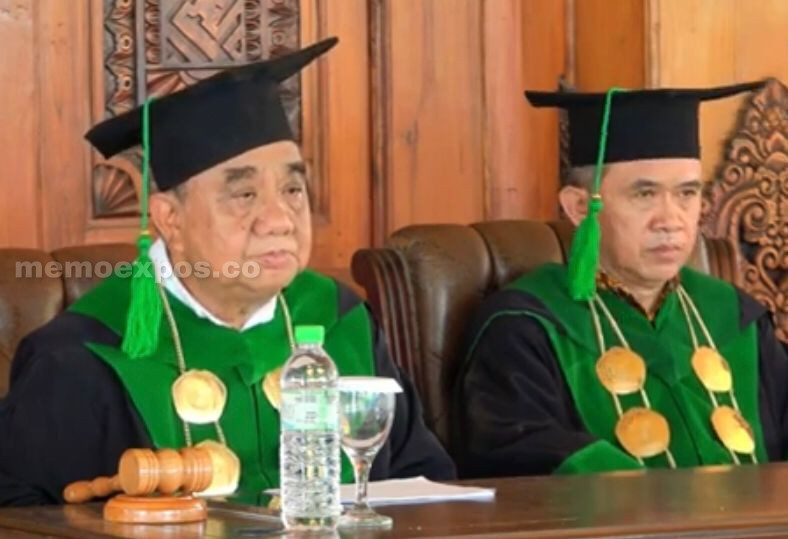 Direktur Politama Mojokerto, Prof. Dr. Martani Husaini (kiri) didampingi Wakil Direktur III Bidang Kerja Sama dan Kehumasan, Supriyanto, S.Pd., M.M., (kanan) saat prosesi wisuda di Balai Kota Mojokerto. (memoexpos.co)