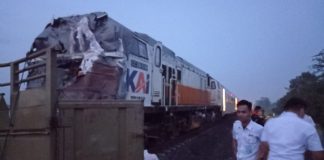 Disambar Kereta Api, Truk Gandeng Bermuatan Pakan Ternak Hancur Berantakan